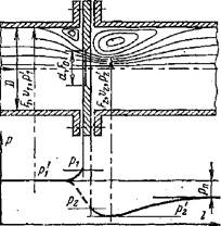 На рис.6.1 показана схема встановлення в трубопроводі найбільш простого звужуючого пристрою (діафрагми) у вигляді тонкого диска із круглим отвором посередині і зображення характеру потоку. Там же даний розподіл статичного тиску Р по довжині потоку /. Стиснення потоку починається перед діафрагмою і завдяки дії сил інерції досягає найбільшої величини на деякій відстані за нею, після чого потік знову розширюється до повного перетину трубопроводу. Перед діафрагмою і за нею в кутах утворяться зони з вихровим рухом, причому зона вихрів після діафрагми більше значна, чим до неї. Тиск потоку біля стінки трубопроводу (суцільна лінія) трохи зростає за рахунок підпору перед діафрагмою і знижується до мінімуму за діафрагмою в точці найбільшого звуження потоку, де перетин потоку менше, ніж отвір діафрагми. Далі в міру розширення потоку тиск біля стінки знову підвищується, але не досягає колишнього значення на величину РП через наявність безповоротних втрат на завихрення, удар і тертя. Зміна тиску потоку по осі трубопроводу практично збігається зі зміною тиску біля його стінки, за винятком ділянки перед діафрагмою і безпосередньо в ній, де тиск потоку по осі труби знижується (пунктирна лінія). При протіканні вимірювального потоку через отвір звужуючого пристрою збільшується швидкість потоку в порівнянні з його швидкістю до звуження. Завдяки цьому тиск потоку на виході із звужуючого пристрою зменшується і на звужуючому пристрої створюється перепад тиску, вимірювальний дифманометром, який залежить від швидкості у звуженні або від витрати потоку.