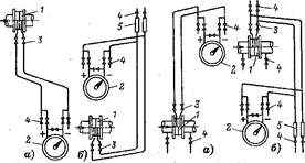 При вимірюванні витрати рідини бажана установка його нижче звужуючого пристрою (рис.6.4, Іа) для того, щоб уникнути проникнення із трубопроводу повітря в сполучні лінії. Якщо ж дифманометр розташовується вище звужуючого пристрою, то у верхніх точках ліній установлюються газозбірники із продувними вентилями поз.4, 5 .