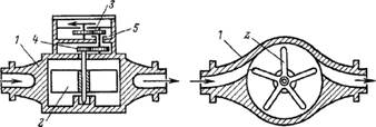 На рис.6.5 наведена схема крильчастого лічильника води. У корпусі 1 із приєднувальними штуцерами виконані два тангенціально спрямованих канали для входу і виходу води, що надходить на крильчатку 2. У верхній частині корпуса розташований стрілочно-роликовий рахунковий покажчик 3, відділений від крильчатки і редуктора 4 перегородкою із сальником 5 вихідної осі.