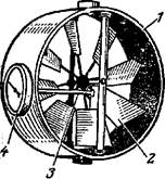 Цей прилад (рис.6.7) являє собою металеве кільце 1, усередині якого на горизонтальній осі закріплена крильчатка 2 з лопатями, що розташовані на спицях під 45° до площини, перпендикулярній осі крильчатки. При вимірюванні анемометр розташовується так, щоб вісь крильчатки була паралельна напрямку потоку, що проходить через кільце. За допомогою черв'ячної пари і осі 3 обертання крильчатки передається рахунковому пристрою 4, закріпленому на зовнішній бічній стороні кільця.